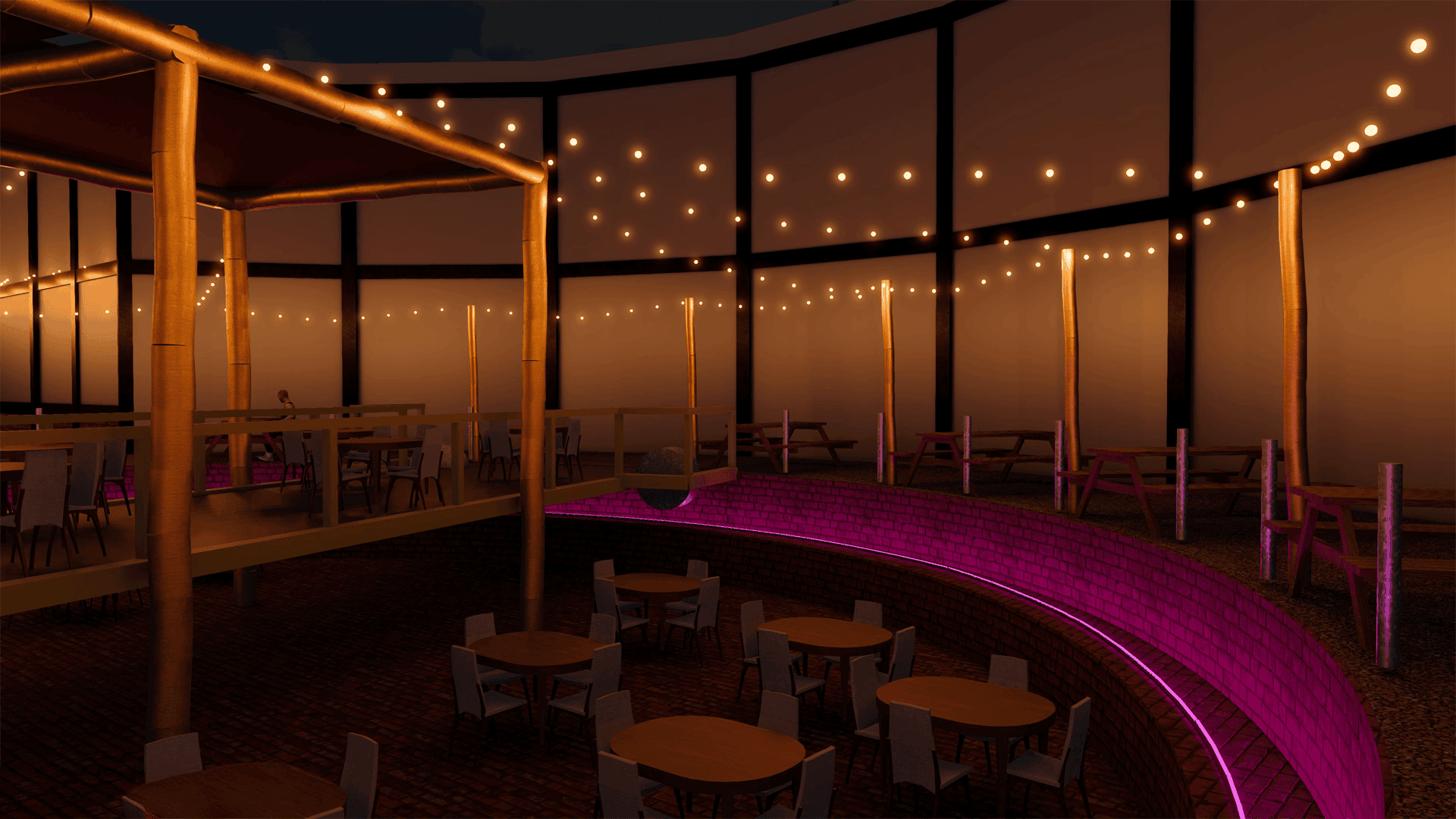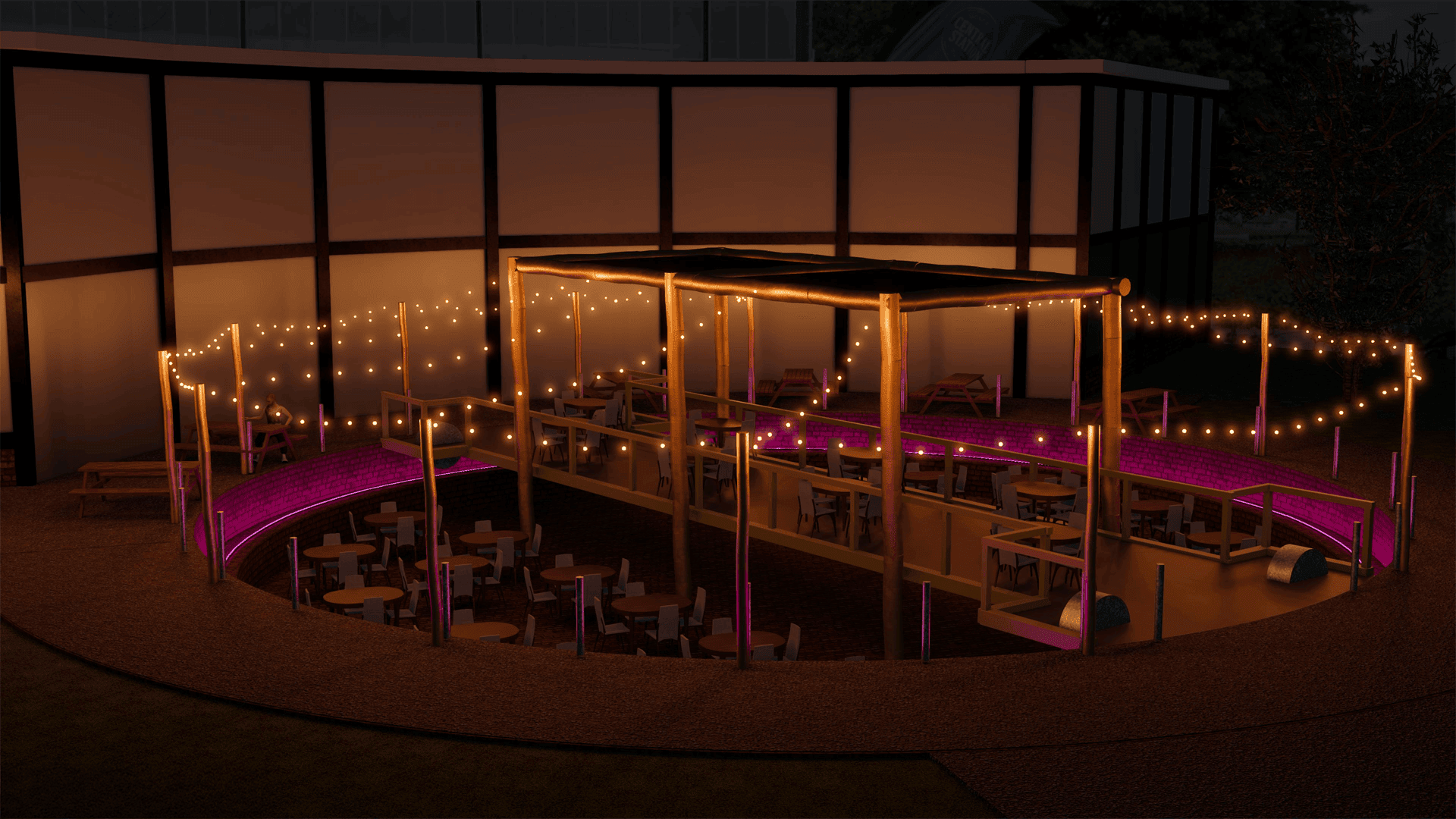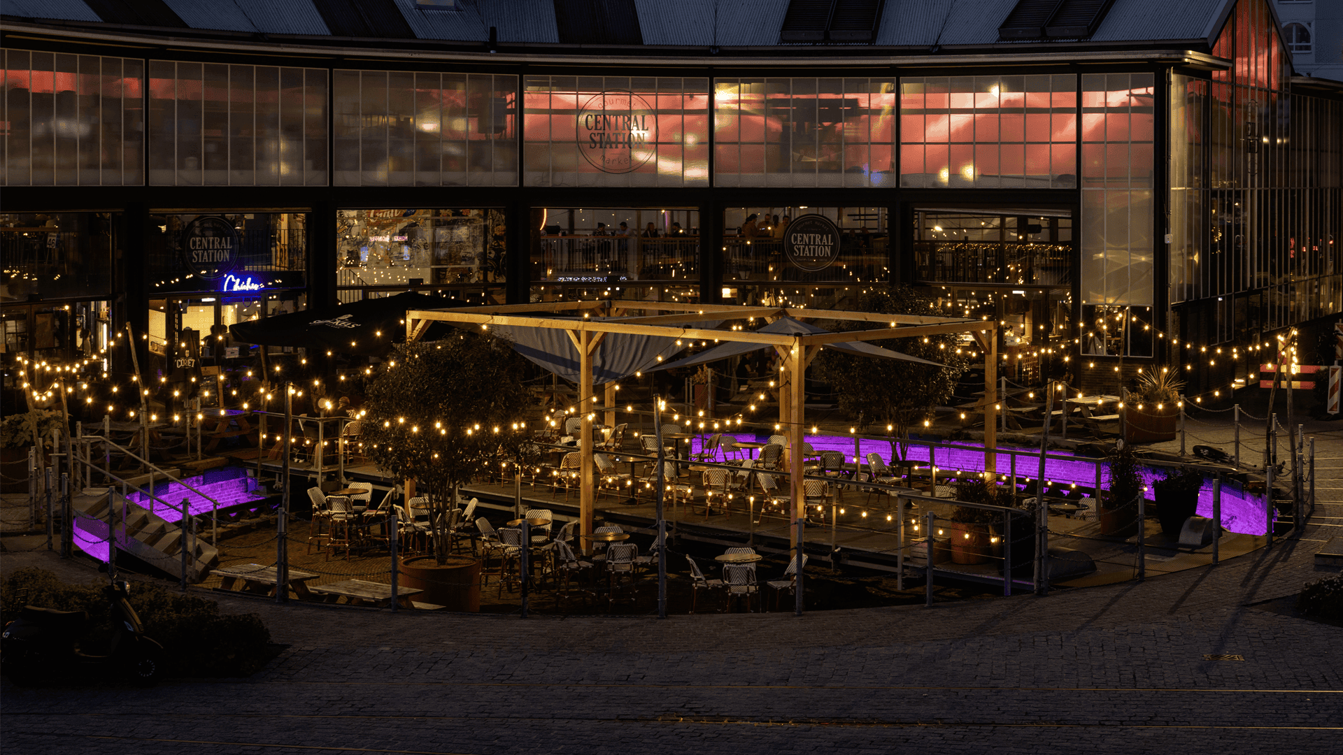 We hebben ervoor gekozen om het geheel aan te kleden met vele warm-witte lampjes. Deze creëren een uitnodigende en informele setting. Daarnaast is er gekozen voor één grote eye-catcher; een grote ledring in de ronde kuil. Dit betrof een oude draaischijf van de toenmalige spoorloods, inmiddels het middelpunt van het gezellige terras. We hebben rekening gehouden met duurzame materialen en tevens zorg gedragen voor demontabele bevestigingen en daarmee de monumentale status in ere gehouden. Zelfs vanaf de perrons is het nu goed zichtbaar dat er een mooie parel te vinden is aan de noord-zijde van het station, een mooi visitekaartje voor gastvrijheid in Tilburg.